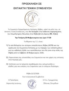 Το Σωματείο Εστίασης Θήβας απευθύνει κάλεσμα συσπείρωσης και ενότητας προς όλα τα μέλη του, συγκαλώντας έκτακτη Γενική Συνέλευση την Τετάρτη 25 Φεβρουαρίου στις 17:30, στην αίθουσα του παραρτήματος του Επιμελητηρίου Βοιωτίας στη Θήβα.