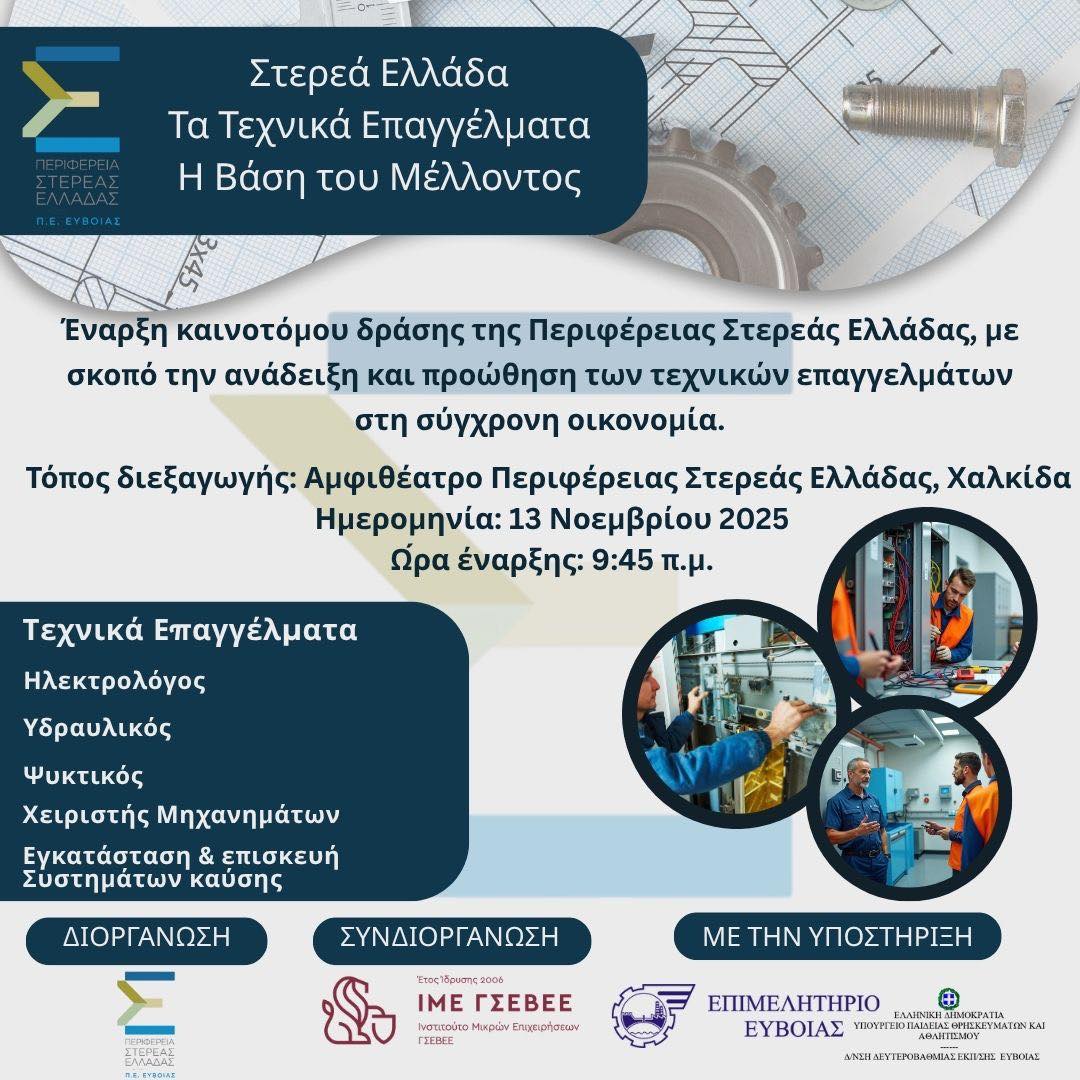 Η Περιφέρεια Στερεάς Ελλάδας κάνει ένα καθοριστικό βήμα δίπλα στους ανθρώπους που αποτελούν τη ραχοκοκαλιά της τοπικής οικονομίας: τους επαγγελματίες και εργαζόμενους των τεχνικών επαγγελμάτων. Πρόκειται για μια νέα δράση ανάδειξης, προώθησης και στήριξης του τεχνικού κόσμου, ο οποίος παραμένει σταθερά η βάση της ανάπτυξης και της παραγωγής, τόσο σε τοπικό όσο και σε εθνικό επίπεδο.