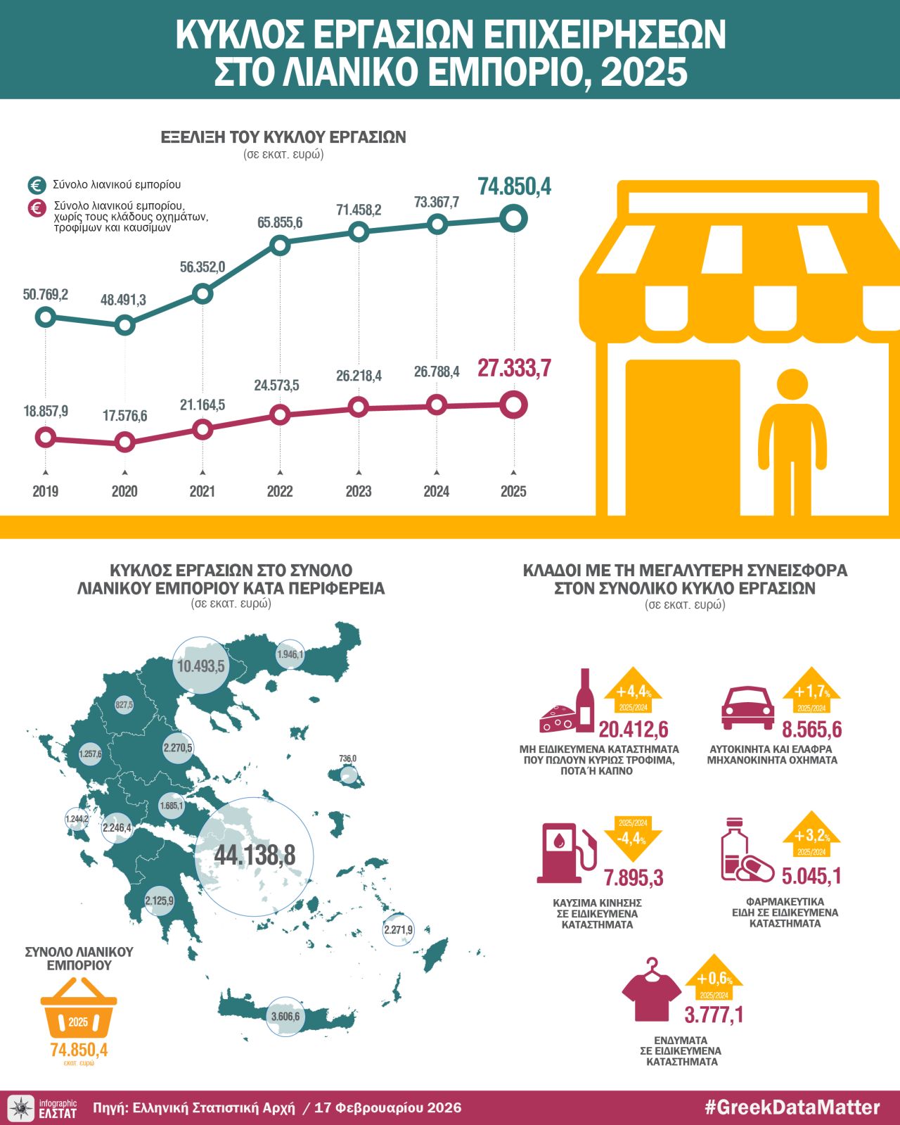 Συνολικά, οι επιχειρήσεις λιανικού εμπορίου στη χώρα σημείωσαν αύξηση 2,0% στον κύκλο εργασιών τους, φτάνοντας τα 74,85 δισ. ευρώ το 2025 σε σύγκριση με 73,37 δισ. ευρώ το 2024. Όταν εξαιρούνται οι κλάδοι των οχημάτων, των τροφίμων και των καυσίμων, η άνοδος παραμένει ίδια, στο 2,0%, με τον κύκλο εργασιών να διαμορφώνεται σε 27,33 δισ. ευρώ.