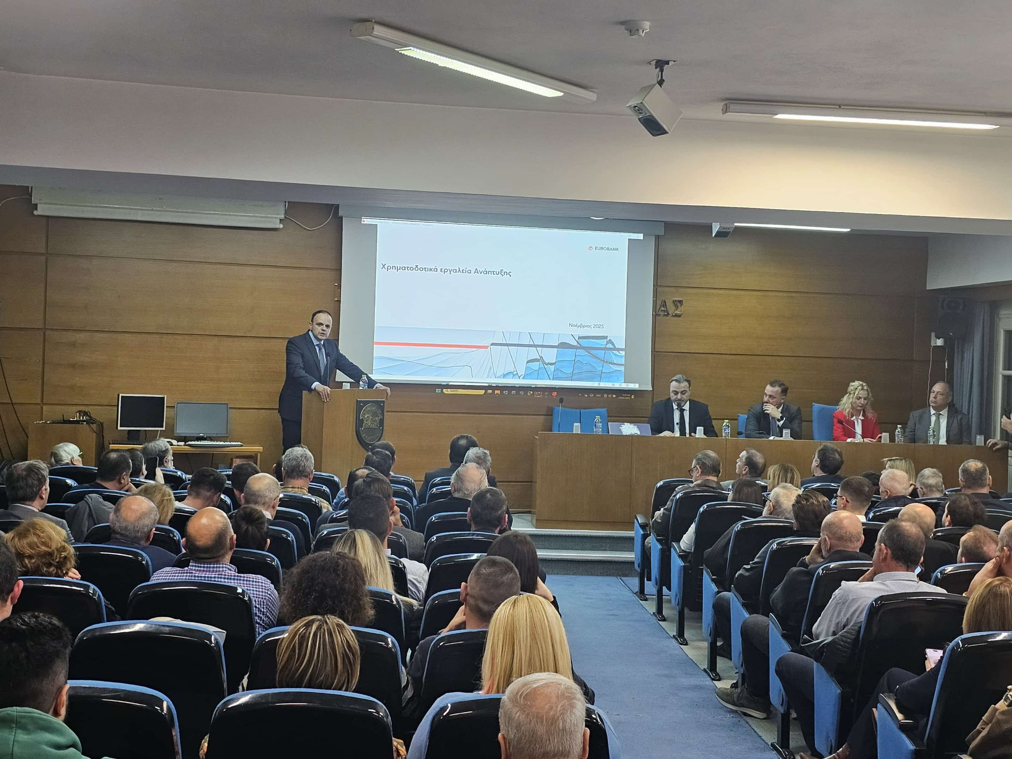 Με εξαιρετικά μεγάλη συμμετοχή πραγματοποιήθηκε την Τετάρτη 19 Νοεμβρίου, στην κατάμεστη αίθουσα του Επιμελητηρίου Βοιωτίας, η ενημερωτική εκδήλωση που διοργανώθηκε σε συνεργασία με την Eurobank και είχε ως αντικείμενο τις δυνατότητες υποστήριξης των μικρομεσαίων επιχειρήσεων μέσω σύγχρονων τραπεζικών εργαλείων και υπηρεσιών. Η μεγάλη προσέλευση επιχειρηματιών από όλη τη Βοιωτία ανέδειξε το έντονο ενδιαφέρον της τοπικής αγοράς για ενημέρωση σχετικά με νέα χρηματοδοτικά προϊόντα και λύσεις που διευκολύνουν την καθημερινή λειτουργία και την ανάπτυξη των επιχειρήσεων.