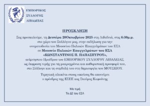 Μία ξεχωριστή εκδήλωση τιμής διοργανώνει ο Εμπορικός Σύλλογος Λιβαδειάς τη Δευτέρα 20 Οκτωβρίου 2025, στις 6:30 μ.μ., στο χώρο του Συλλόγου. Στο επίκεντρο της εκδήλωσης βρίσκεται η ονοματοδοσία του Μουσείου Παλαίων Επαγγελμάτων του ΕΣΛ σε «Μουσείο Παλαίων Επαγγελμάτων του ΕΣΛ – Κωνσταντίνος Π. Παπασπύρου», προς τιμήν του αείμνηστου προέδρου του Συλλόγου, Κωνσταντίνου Παπασπύρου, για τη μακροχρόνια και καθοριστική προσφορά του στην τοπική εμπορική κοινότητα και τη συμβολή του στη δημιουργία του Μουσείου.