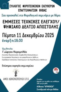 Ένα ιδιαίτερα σημαντικό και επίκαιρο φορολογικό σεμινάριο διοργανώνει ο Σύλλογος Φοροτεχνικών Ελευθέρων Επαγγελματιών Θήβας (ΣΦΕΕ Θήβας) την Πέμπτη 11 Δεκεμβρίου 2025, στο Συνεδριακό Κέντρο Θήβας, με ώρα έναρξης 16:30.