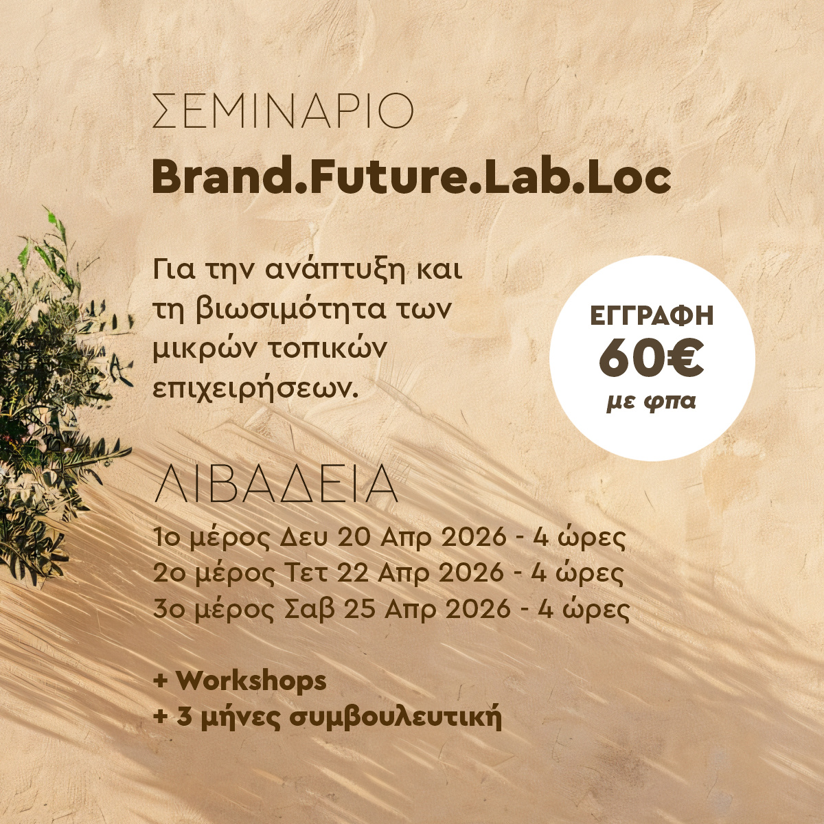 Το Brand.Future.Lab.Loc φιλοδοξεί να αποτελέσει ένα ουσιαστικό εργαλείο ενδυνάμωσης των μικρών επιχειρήσεων, σε μια περίοδο όπου η ταυτότητα, η εμπειρία πελάτη και η στρατηγική διαφοροποίηση καθορίζουν ολοένα και περισσότερο τη βιωσιμότητα και την ανάπτυξή τους.