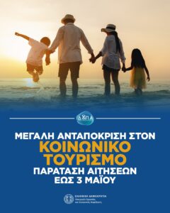 Λόγω της συνεχιζόμενης μεγάλης συμμετοχής στη διαδικασία υποβολής αιτήσεων για το Πρόγραμμα Κοινωνικού Τουρισμού Εργαζομένων και Ανέργων περιόδου 2026–2027 της Δημόσιας Υπηρεσίας Απασχόλησης (ΔΥΠΑ) και λαμβάνοντας υπόψη την αυξημένη ζήτηση, με στόχο τη διασφάλιση της καθολικής πρόσβασης στην πλατφόρμα και την καλύτερη δυνατή εξυπηρέτηση όλων των ενδιαφερομένων, αποφασίζεται η παράταση της προθεσμίας υποβολής αιτήσεων έως την Κυριακή 3 Μαΐου και ώρα 23:59.